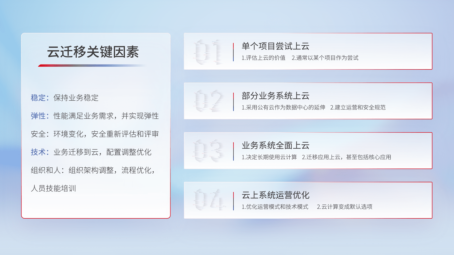 结合实际业务,,,从规划设计、、云平台选型、、、、云原生改造、、、数据迁移、、、集成交付,,,迁移全过程为客户识别最佳上云路径,,,,做好风险识别管理,,,设计网络架构、、身份权限、、安全审计合规、、、操作审计、、日志审计、、、、监控告警策略、、、多站点容灾设计等,,对云上基础设施进行整体规划,,提升IT治理水平,,以满足弹性、、、、高可用、、高性能的需求。。